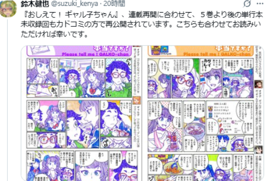 由漫画家铃木健也创作的漫画《百无禁忌!女高中生私房话》(おしえて! ギャル子ちゃん),自2021年因作者涉嫌从德国进口违法刊物被捕后,一直处于休刊状态。