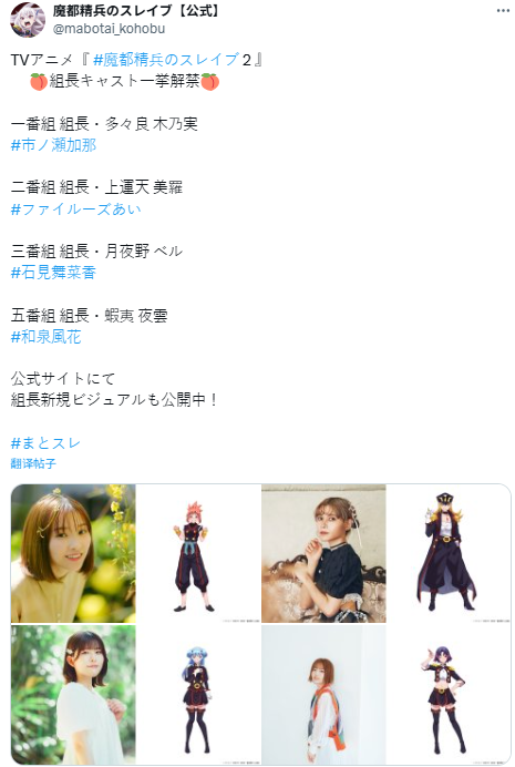 根据作家Takahiro与漫画家竹村洋平所著漫画《魔都精兵的奴隶》改编的电视动画官方X账号于周六宣布,第二季动画将于1月8日在东京MX、BS朝日、MBS和AT-X频道首播。该账号同时公布了新加盟的声优阵容,并预告将有更多消息发布。