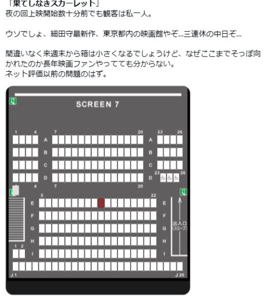 尽管有少数观众对芦田爱奈的演技、歌唱以及影片背景与水面作画表示肯定,但整体口碑仍显低迷。这种负面反响似乎直接影响到了票房表现:上映首日,横滨某影院的观影人数寥寥;而在连休周末的周日,东京都内一家影院甚至仅有一名观众入场。上映不到一周,该片的入座率已低于许多上映超过一个月影片的水平。