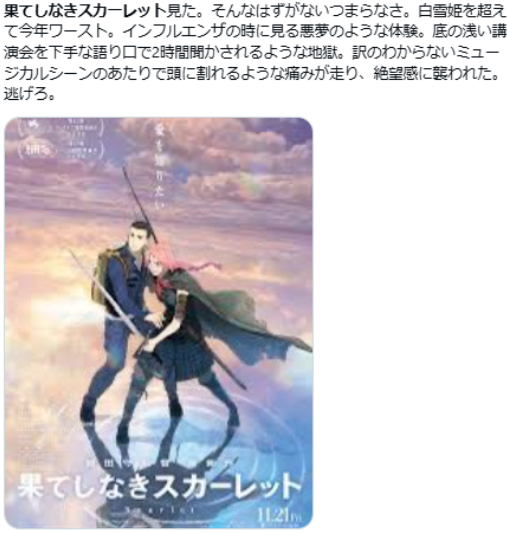 虽然电影审美本就主观,但《无尽的斯嘉丽》目前的口碑恐难复制细田守前作《龙与雀斑公主》66亿日元的票房成绩。影片最终表现如何,仍需市场进一步验证。