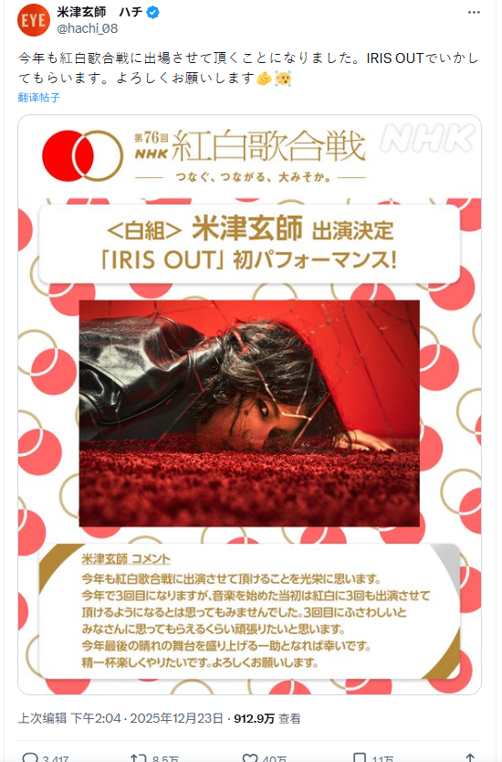 NHK 官方近日正式宣布第 76 回 “NHK 红白歌唱大赛”的追加出演名单,确认日本创作天王米津玄师将代表白组登台献唱。这也是米津玄师继过去两次精彩演出后,生涯第三度受邀登上红白舞台。官方同步公开了他当晚的表演曲目,确定将演唱人气动画剧场版《电锯人:蕾塞篇》的主题曲“IRIS OUT”,这也将是该首热门歌曲在电视荧幕上的首度公开演出。