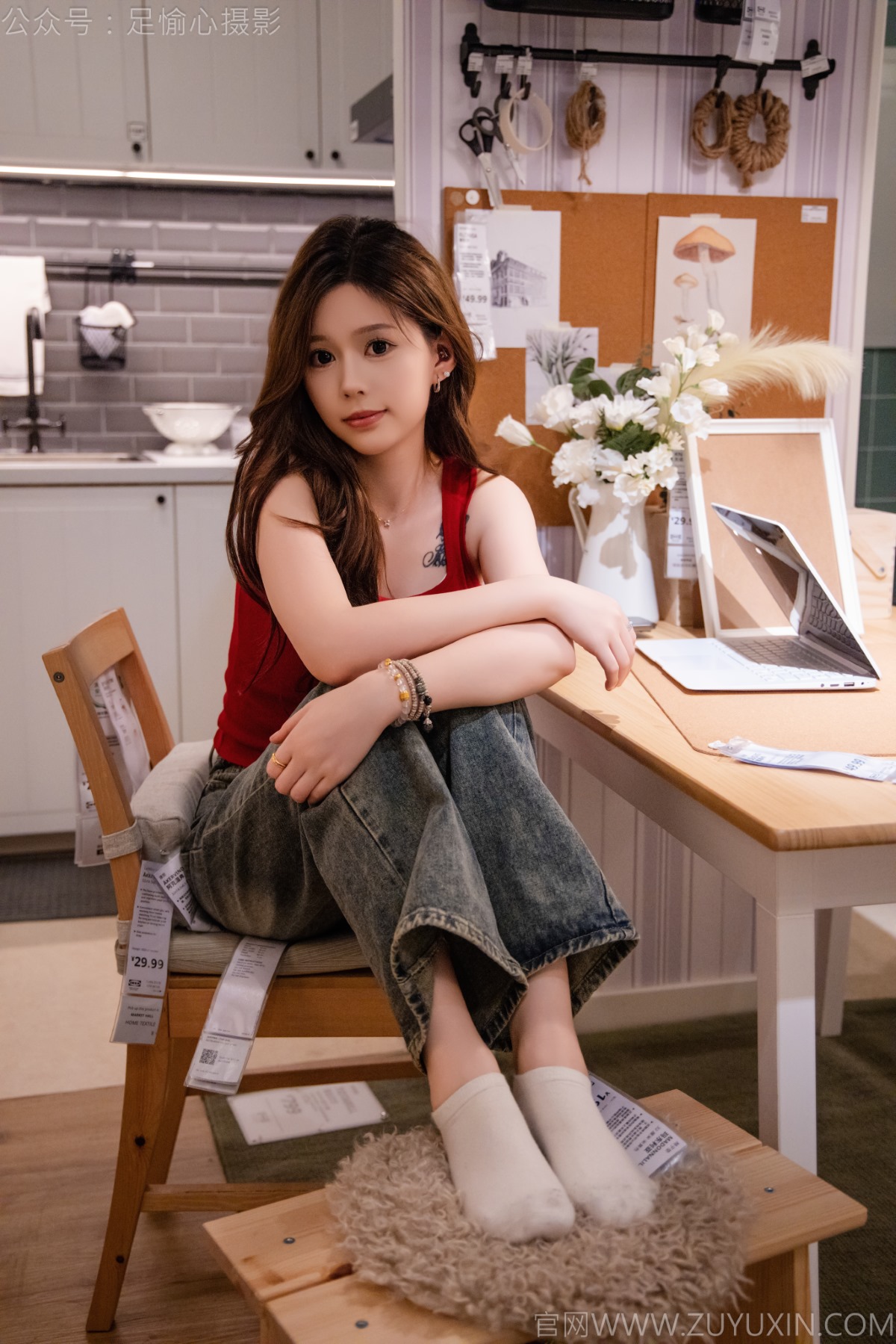 搭配内容:红色吊带、牛仔长裤、宽松板鞋、白色棉袜、裸足