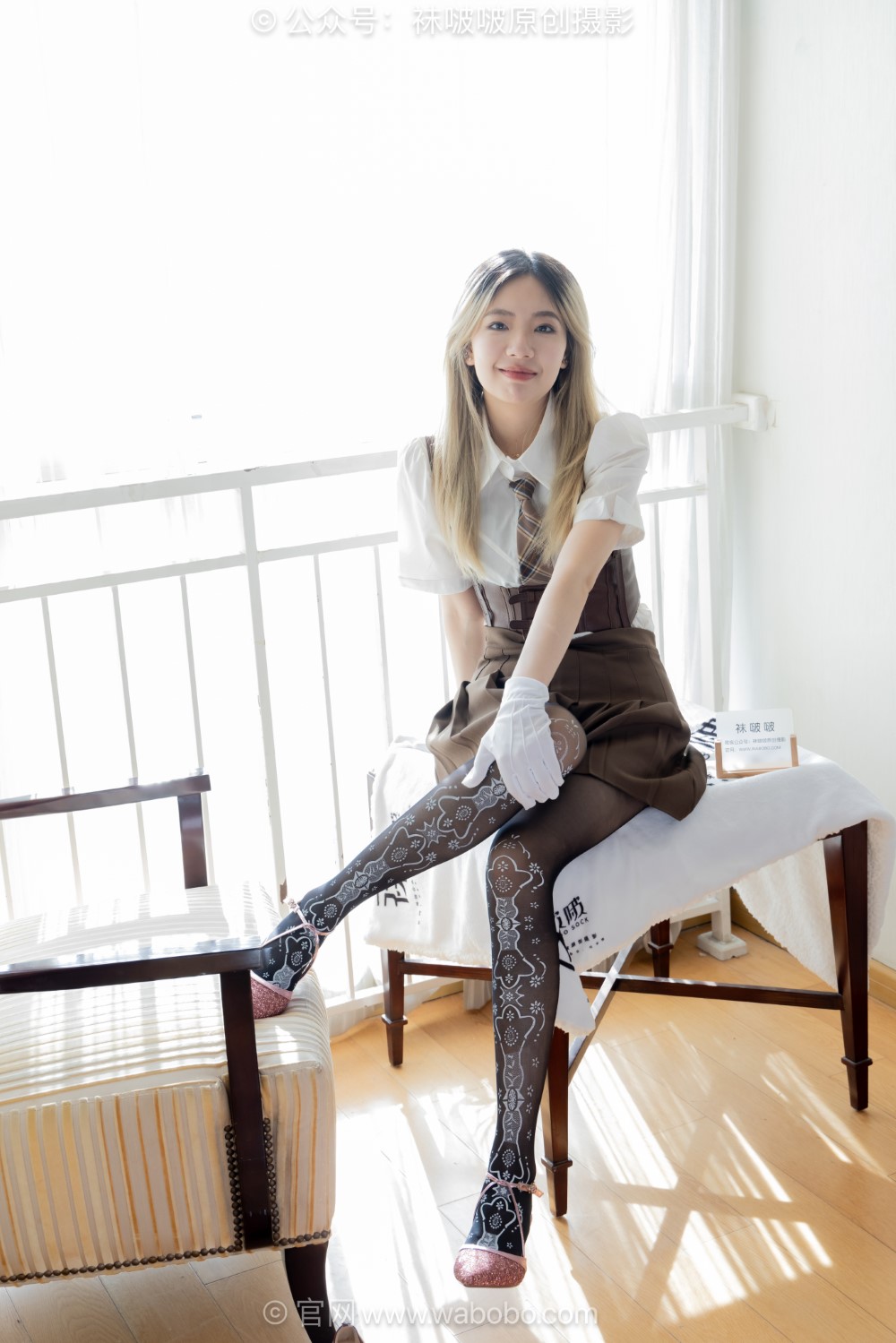 这是“BoBoSocks袜啵啵”原创摄影系列的第682期作品,主角为模特小甜豆。画面中,她身穿白色短袖衬衫,搭配棕色格纹领带与同色系高腰百褶背带裙,外束棕色皮质束腰,整体造型融合了学苑风与复古元素。她佩戴白色长款手套,双腿穿着带有印花细节的薄款黑色丝袜,脚踩酒红色尖头高跟鞋,造型精致且富有层次感。小甜豆留着浅金色长发,妆容清透自然,眼神温柔直视镜头,神情恬静中带有一丝俏皮。她坐在铺有白色绒毯的古典花纹软椅上,姿态优雅,背景为纯白墙面与木质地板,光线柔和明亮,突显人物主体。画面下方可见“袜啵啵”品牌标识与官网信息,整体风格清新甜美,兼具时尚感与品牌辨识度,展现都市少女的精致与活力。